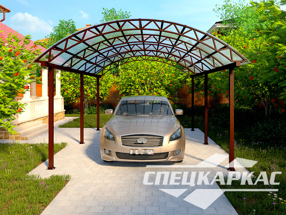Арочная конструкция обеспечивает комфортное нахождение на защищенной от непогоды площадке автомобиля. Расчет строения проводился с учетом особенностей климата европейской части России, поэтому конструкция с легкостью выдержит ураганный ветер, обильные ливни и снежные заносы. При грамотном уходе навес из поликарбоната сохранит герметичность и защитные характеристики почти 20 лет. Форма кровельной поверхности, выполненная под уклоном, не даст копиться на крыше избыткам воды или снега, что значительно облегчит уход за кровлей.